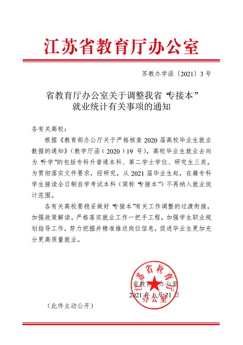 2021年1月21日,江苏省教育厅下发《省教育厅办公室关于调整我省‘专接本’就业统计有关事项的通知》,现将文件予以发布,请各单位知晓,并遵照执行。